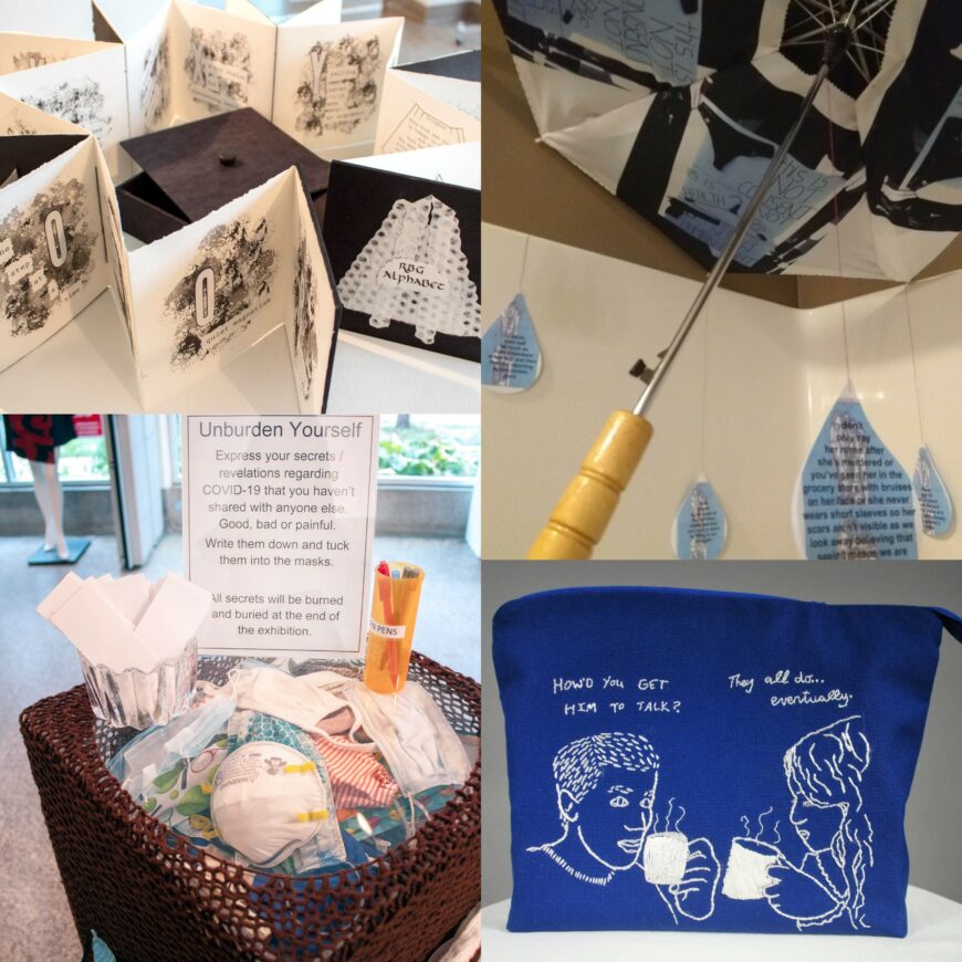 (Photos pictured clockwise, a part of the A Common Thread 2021 exhibition: RBG Alphabet Book, Georgia Greeley; Do Something: Now Walk The Walk, Trina Porte; Good Cop, Bad Cop: The Teachers’ Lounge, Amanda Shopa; Unburden Yourself, Lorri Talberg)