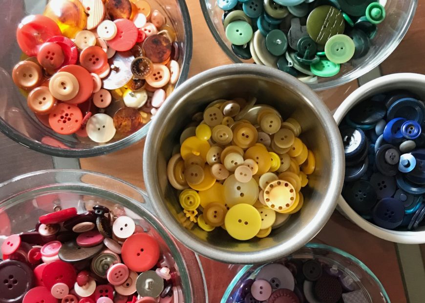 In addition, she has been sorting her ever-growing collection of buttons. “Some of you may remember my button dress from a few years back, which had nearly 4,000 buttons sewn to it.” This piece, ‘Doing’ Dress, was featured in our A Common Thread member exhibition in 2017 (see picture below).