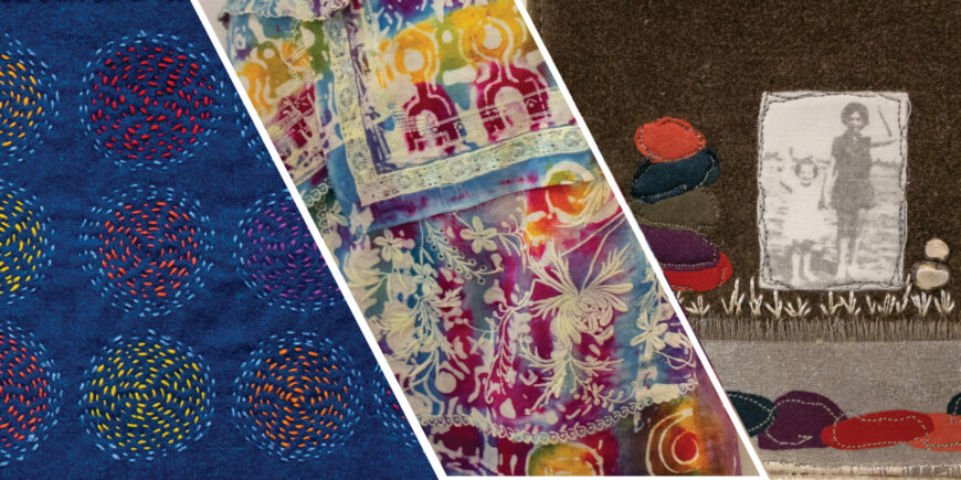 (Header photo: detail from Thirteen Moons Part I and II, Laura Sindberg; detail from Fancy Singlet Shirt, Laura Burlis; detail from Reliquary: Stepping Stones, Marilyn Turner)